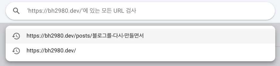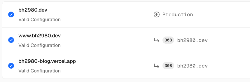이 경우 https://bh2980.dev/posts와 https://bh2980-blog.vercel.app/posts 를 각각 다른 URL로 인식하여 색인하기 때문에 결과가 분산되는 문제가 생깁니다. 이를 방지하기 위해 대표 도메인으로 정하고 나머지는 모두 https://bh2980.dev로 리다이렉트되도록 통일했습니다.